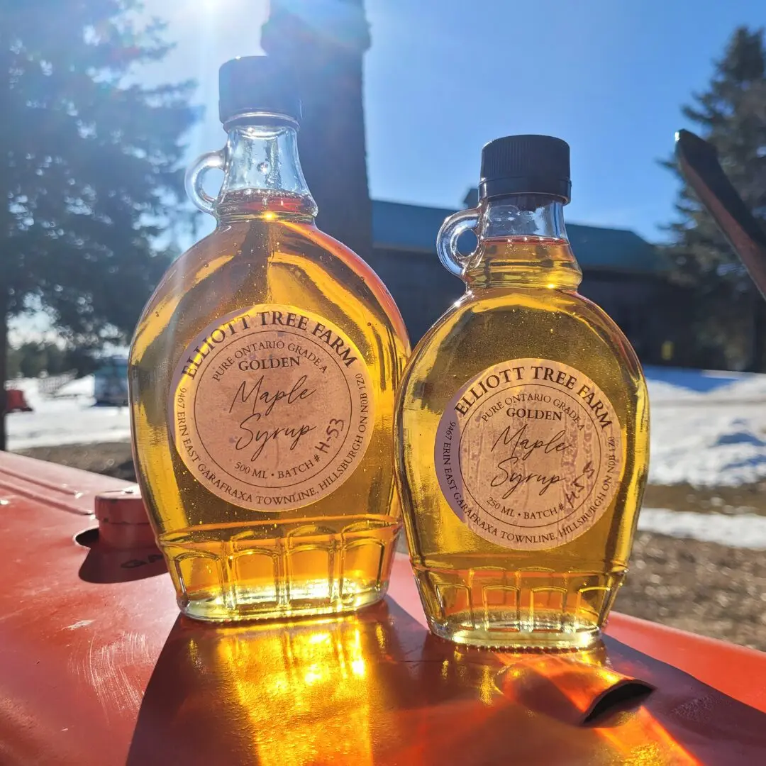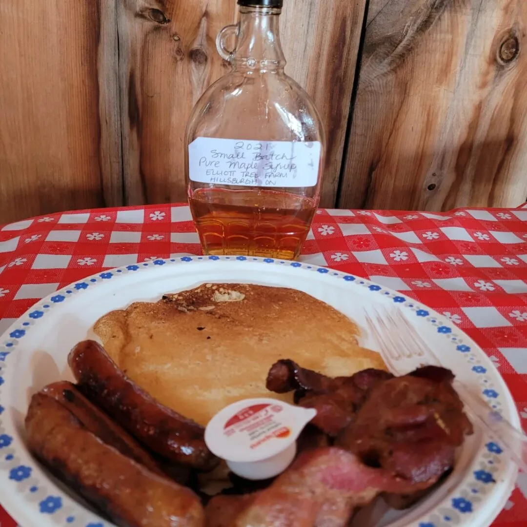 - Elliott Tree Farm Ontario Pure Maple Syrup with freshly grilled pancakes and a side of fresh cut Canadian side bacon, maple breakfast sausage and fresh butter, hot apple cider, or coffee, or tea, and juice or bottled water.